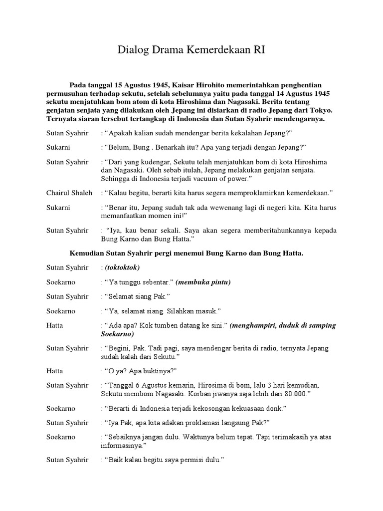Naskah drama detik detik proklamasi kemerdekaan. You need to use an appropriate expression to asking or giving opinions. Nah berikut Kumpulan contoh Teks pidato tentang Hari Kemerdekaan untuk Siswa SD SMP SMA dan Lomba Terbaru.